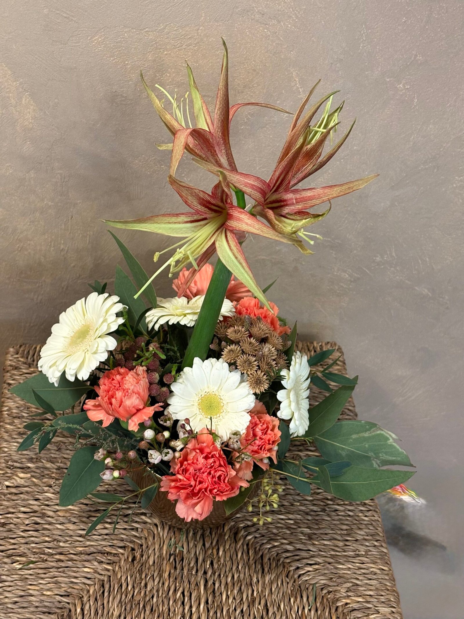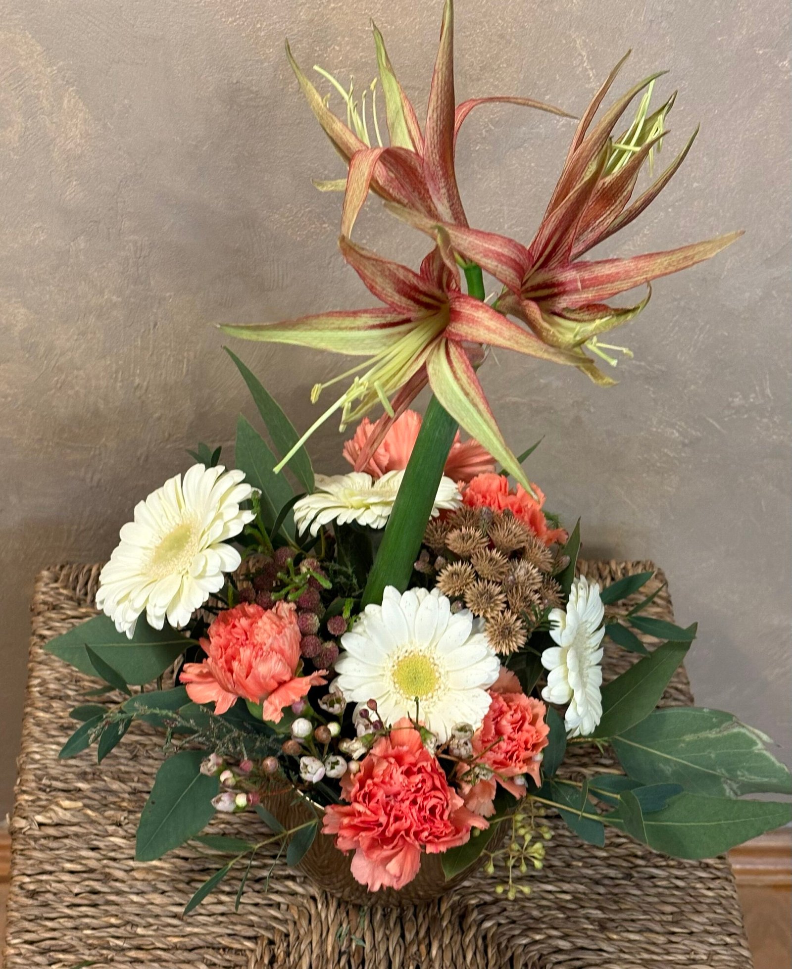 Un aranjament floral statement, cu un design vertical elegant, ideal pentru spațiile care au nevoie de un punct de atracție vizuală. Compoziția îmbină armonios flori în nuanțe calde de somon și alb, completate de verdeață decorativă bogată și o amarylis, floarea centrală spectaculoasă, care oferă înălțime și personalitate aranjamentului.