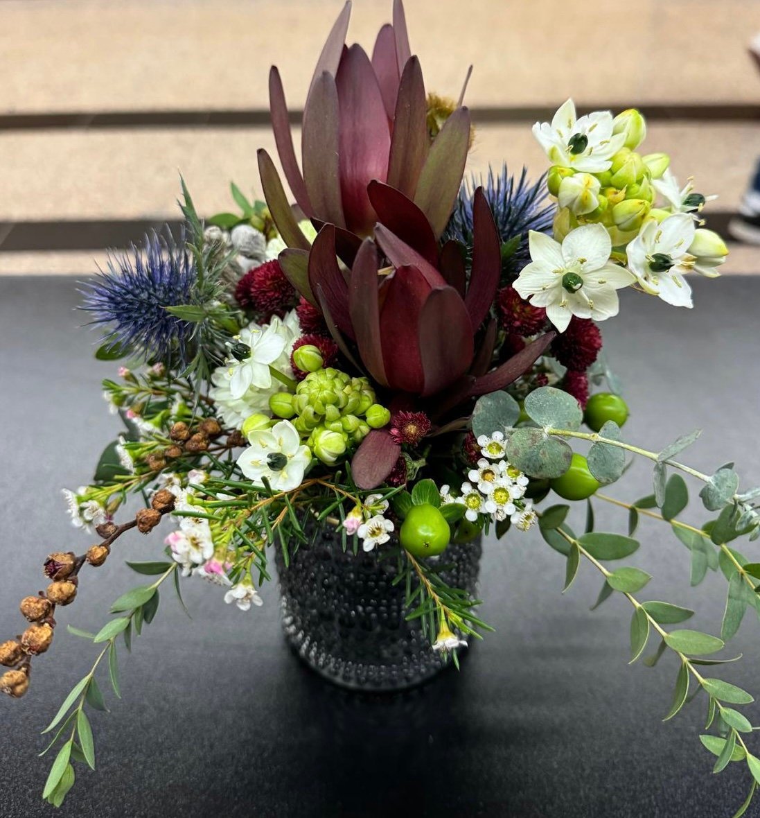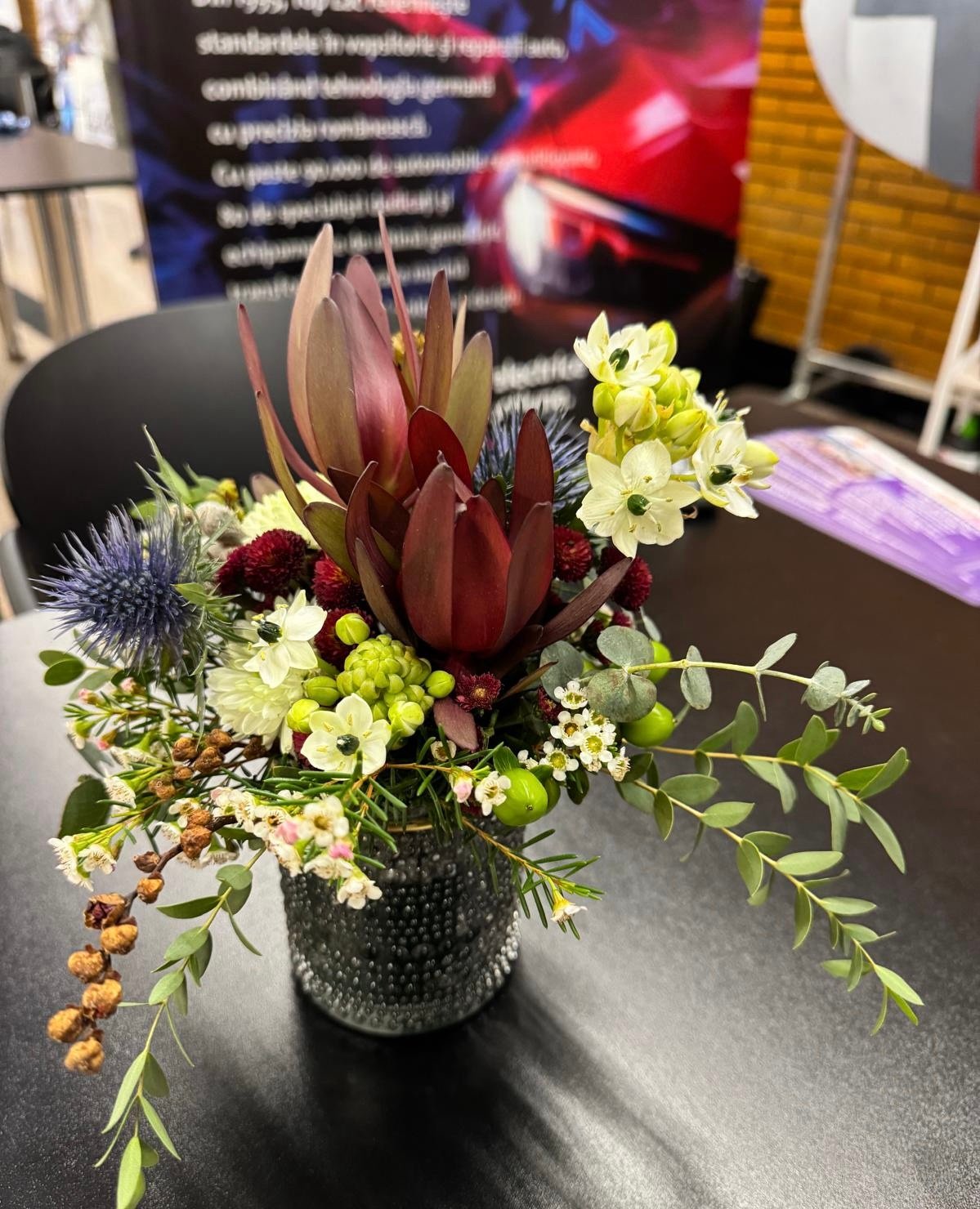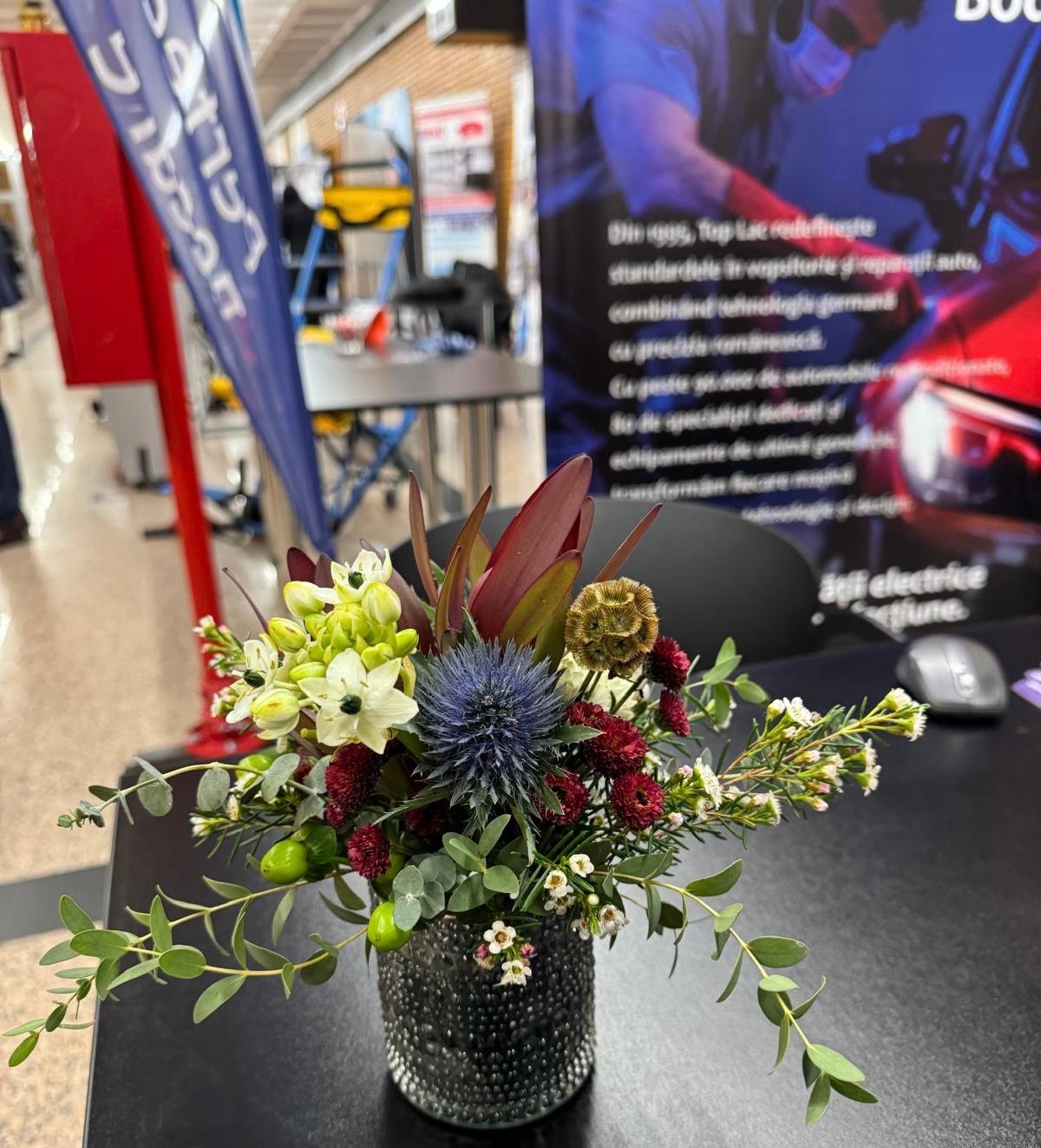 Un aranjament modern în nuanțe de burgund, verde și alb, ce combină texturi elegante și naturale. Florile de eustoma, eryngium și craspedia se împletesc cu accente verzi de eucalipt și hypericum, creând o compoziție rafinată, potrivită pentru spații corporate sau interioare contemporane.
