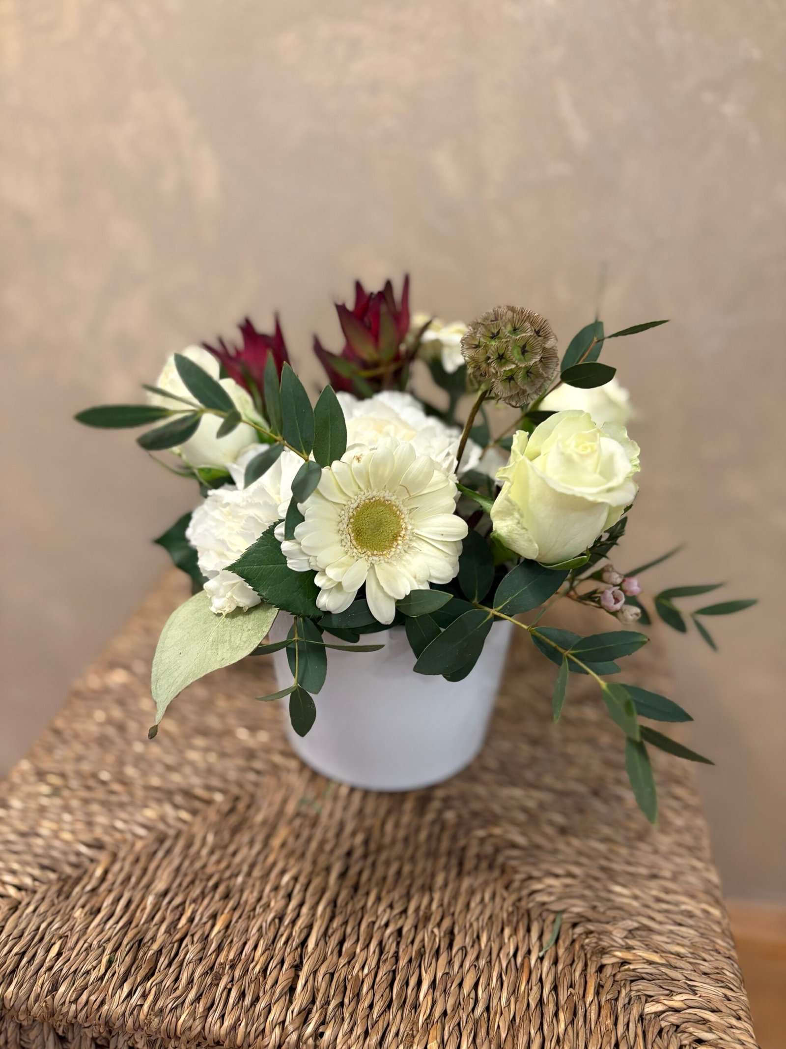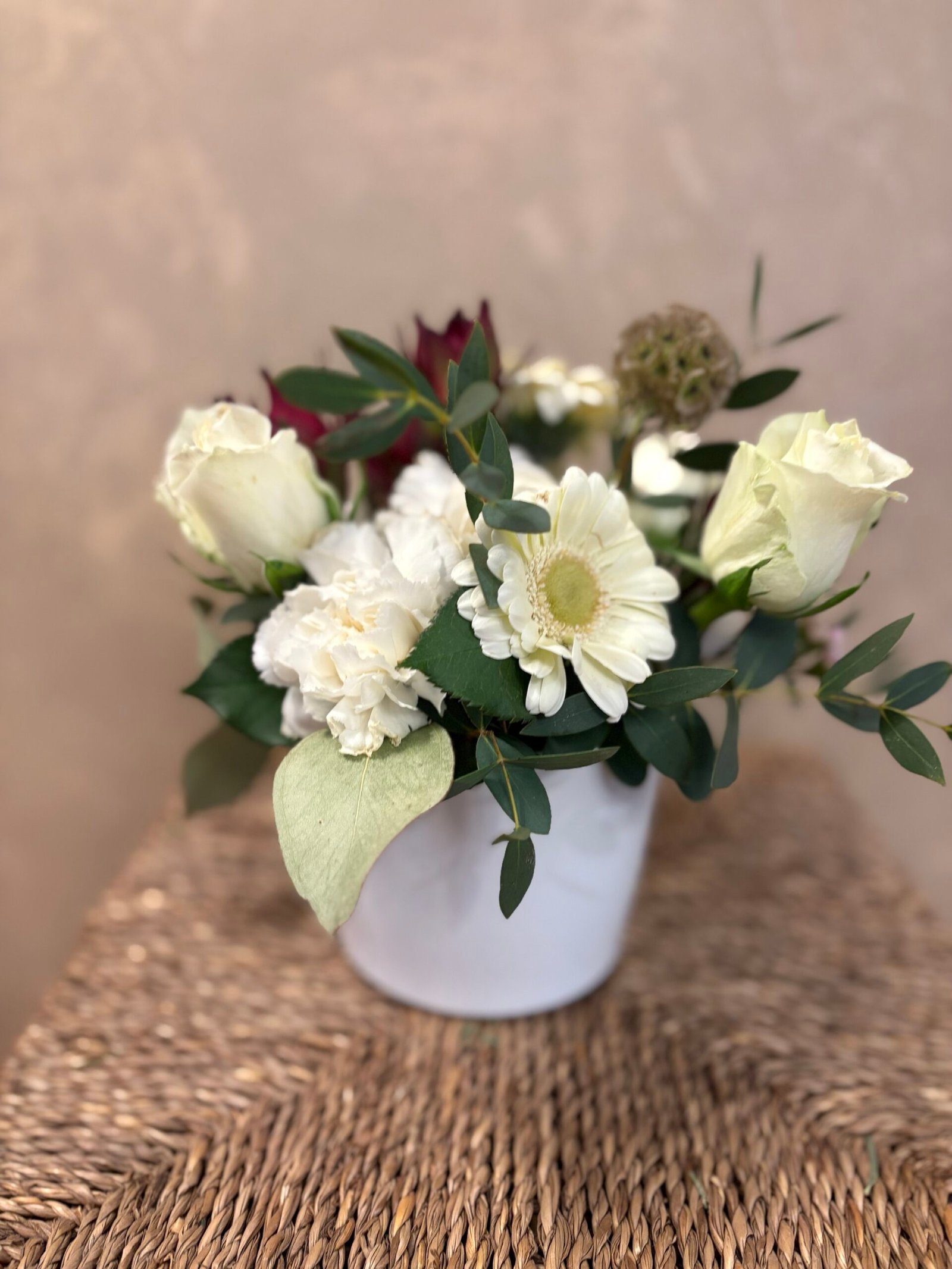 Creat manual într-un vas ceramic alb, cu design minimalist, aranjamentul este potrivit atât pentru decorarea casei sau biroului, cât și ca dar cu semnificație specială.