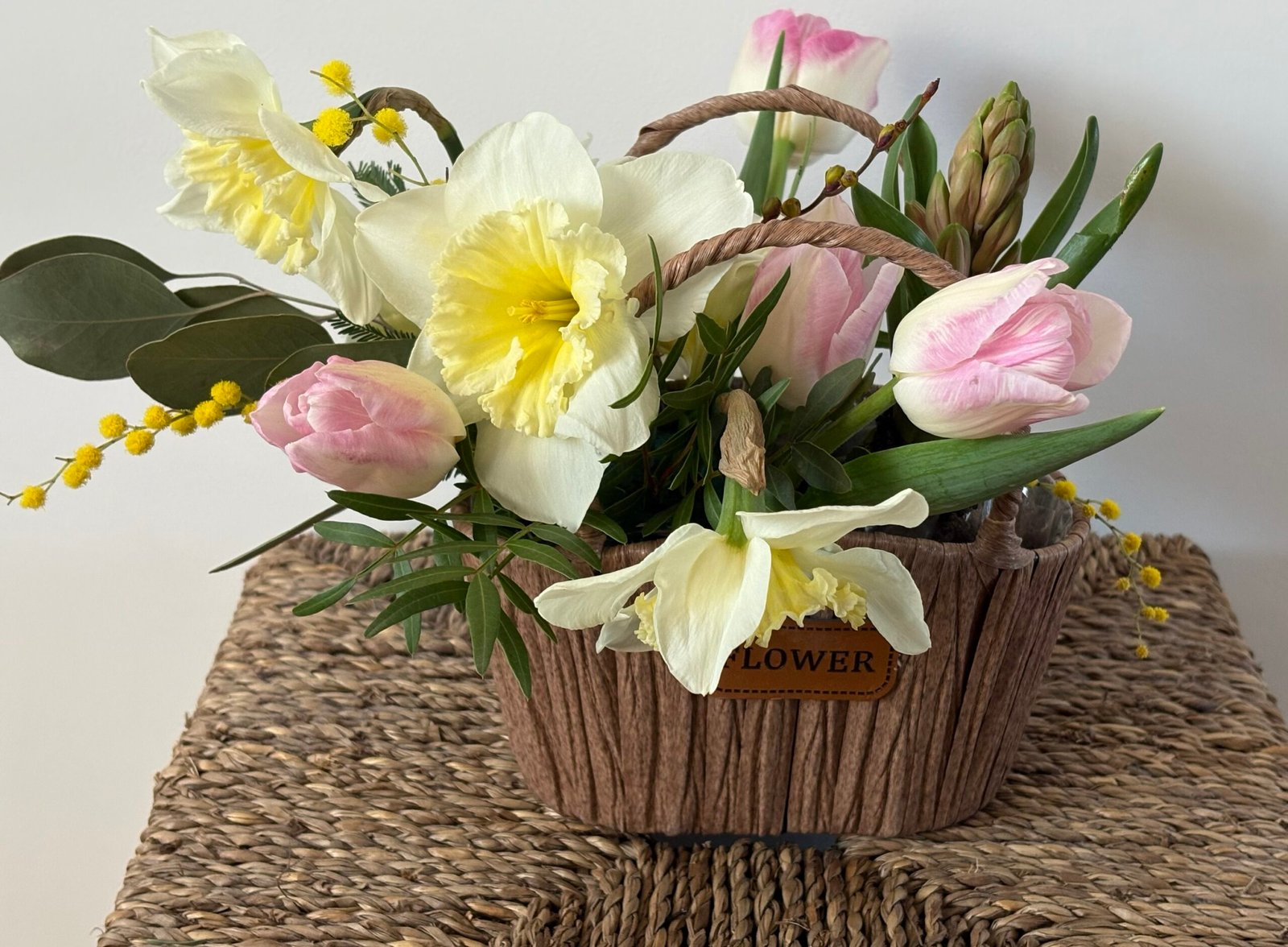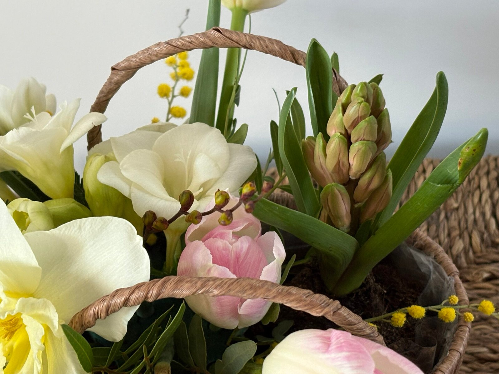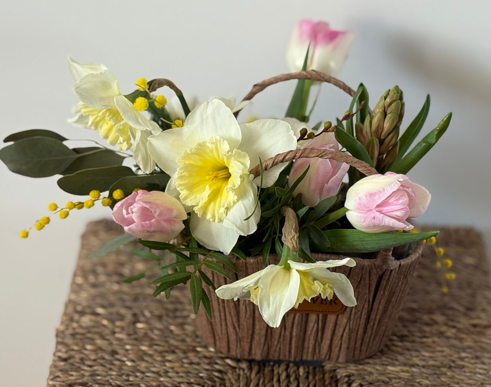 Compoziția îmbină armonios narcise delicate, lalele în tonuri pastelate, accente fine de mimosa și verdeață naturală, într-un echilibru de texturi și forme care evocă naturalețea începutului de sezon.