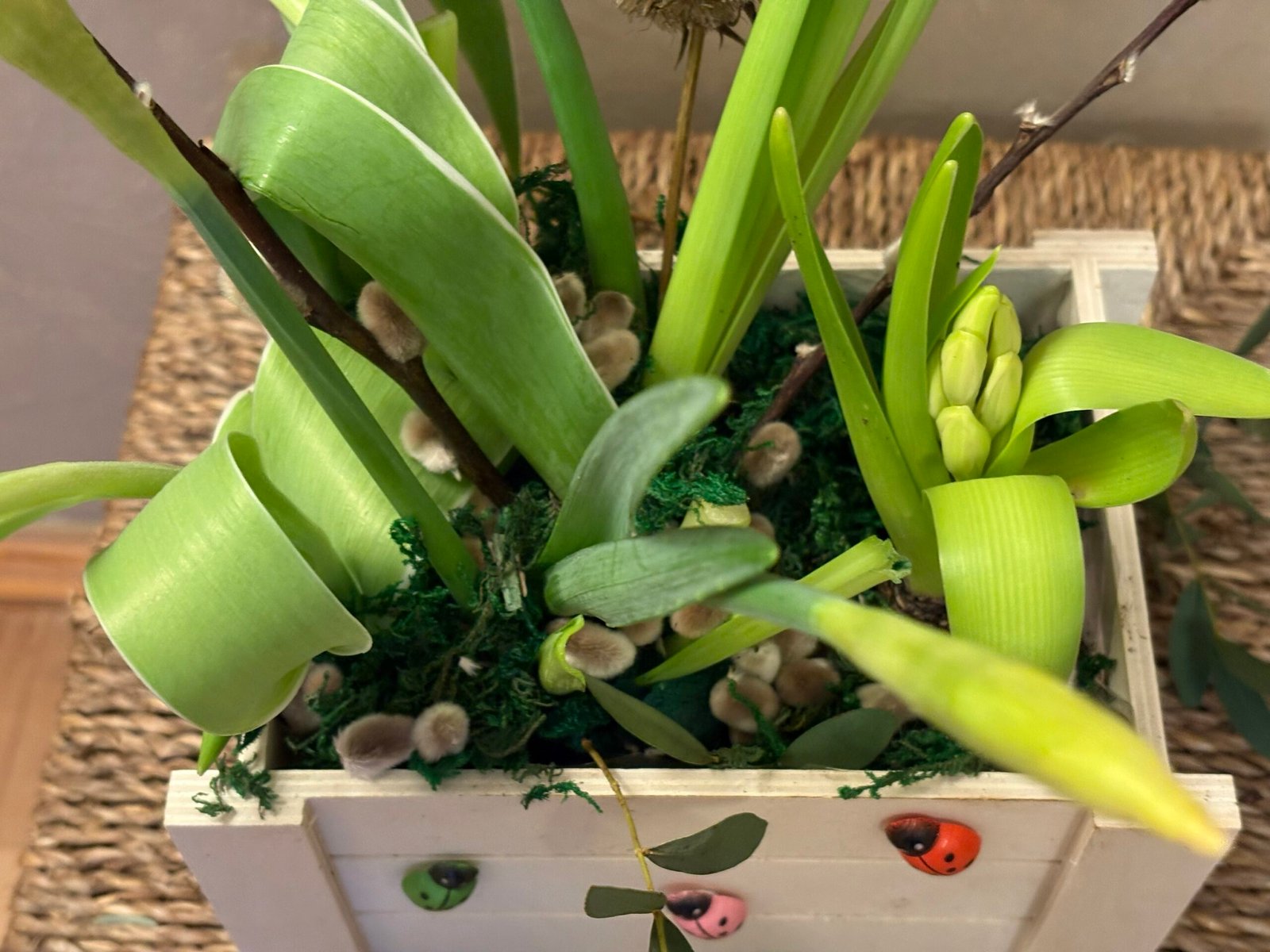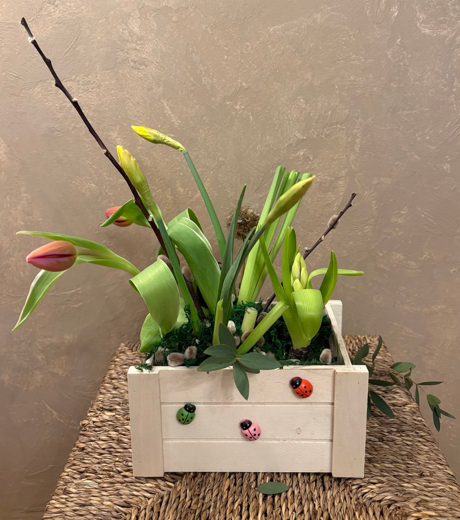 Așezată într-o ladă din lemn, cu elemente naturale și verdeață atent selecționată, zambila își continuă procesul firesc de creștere, urmând să înflorească și să parfumeze spațiul în care este așezată.
