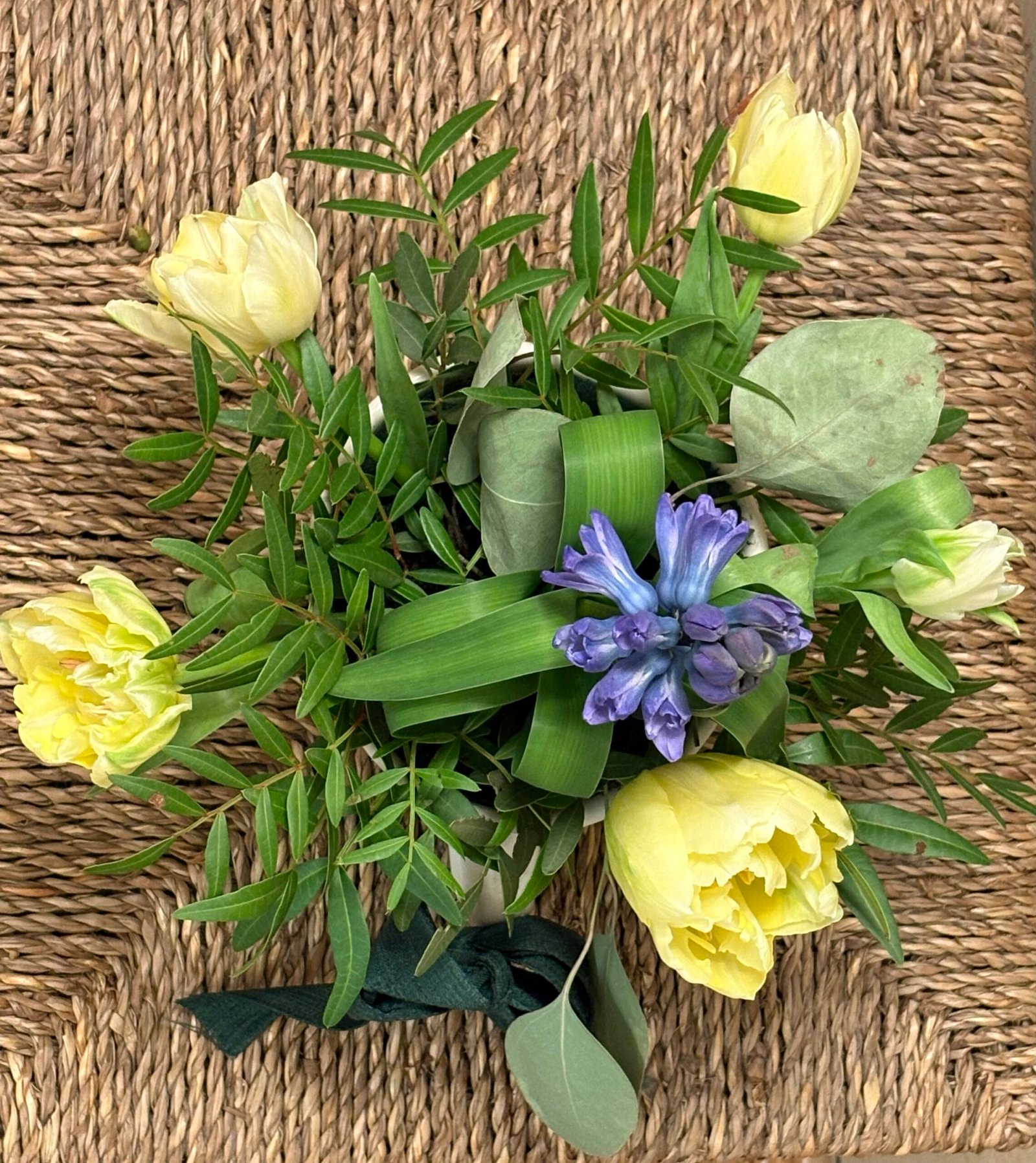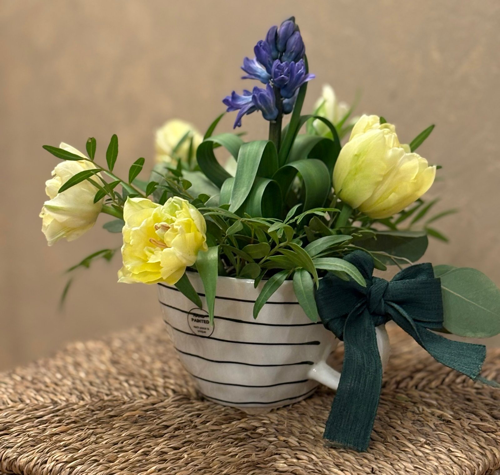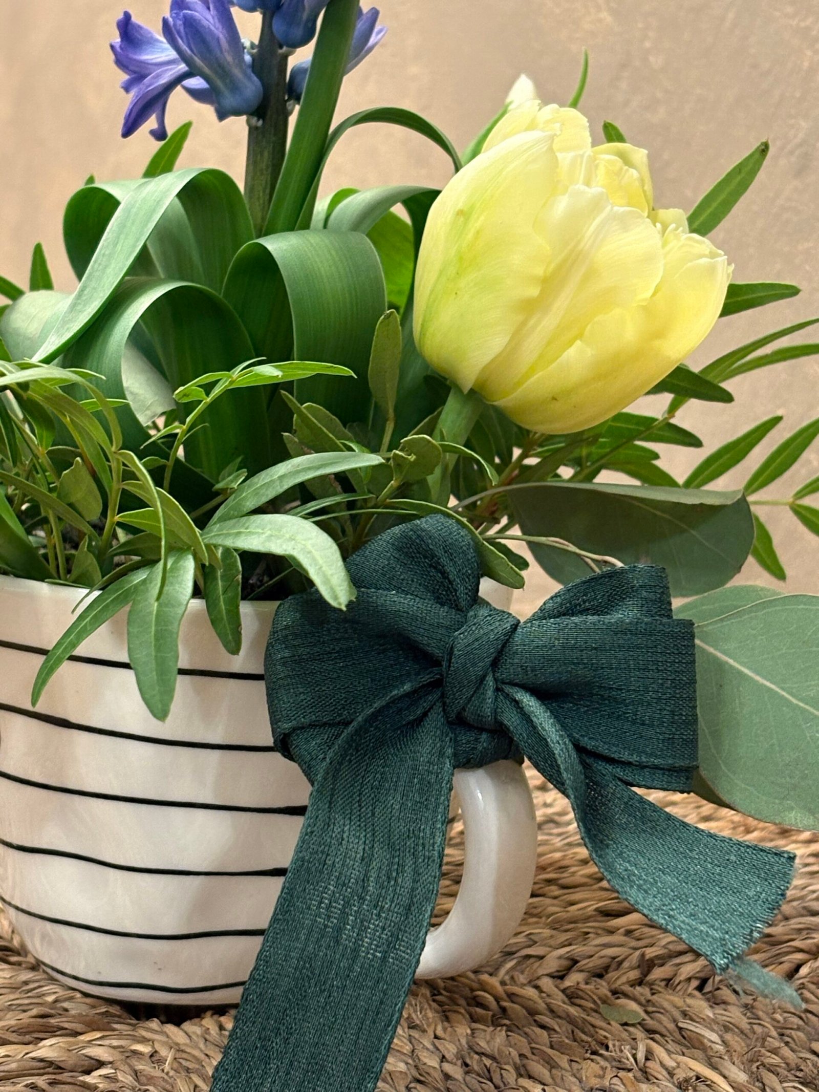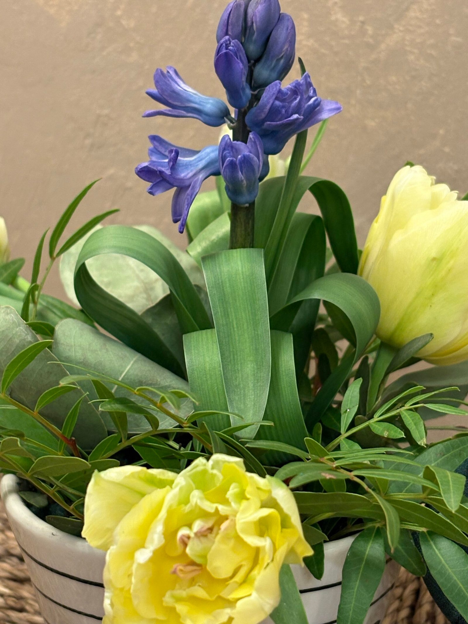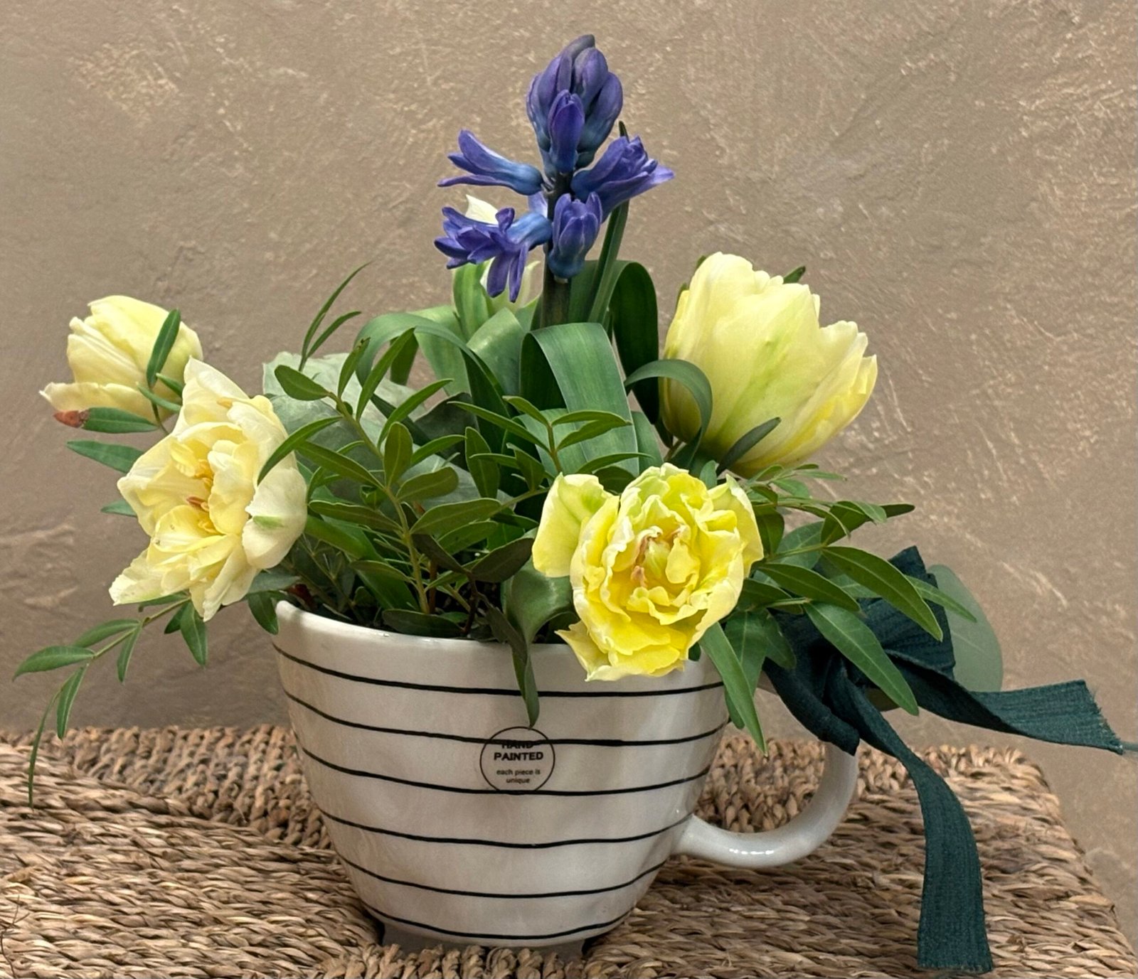 Un aranjament floral creat cu grijă, în serie limitată, ce aduce împreună naturalețea florilor de primăvară și farmecul obiectelor cu suflet.