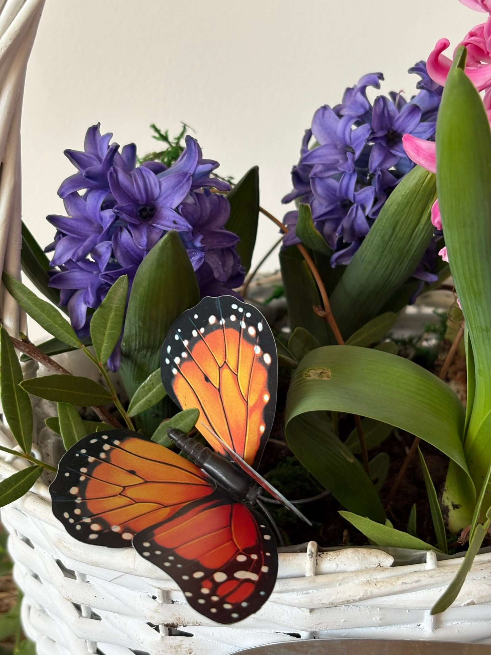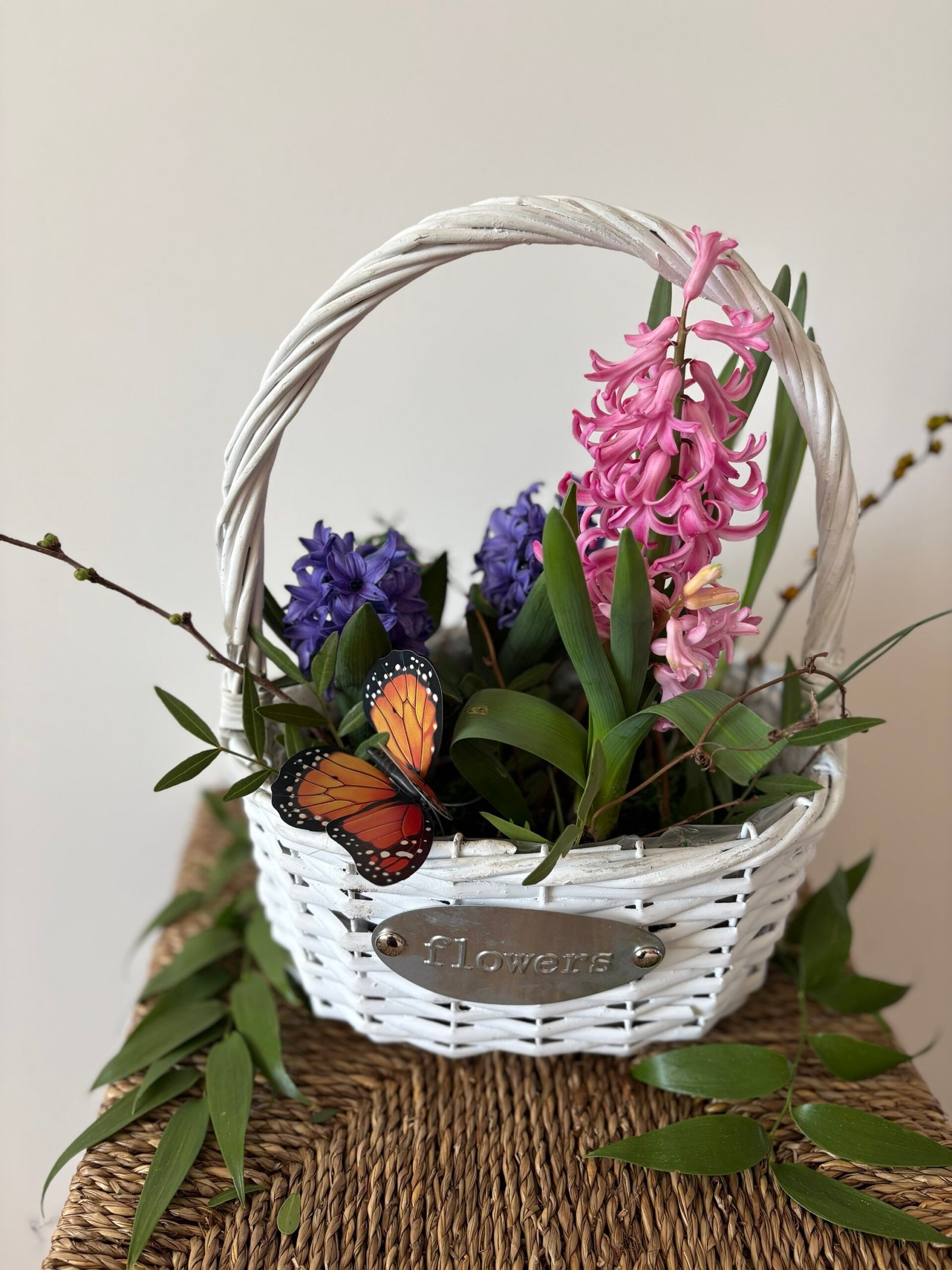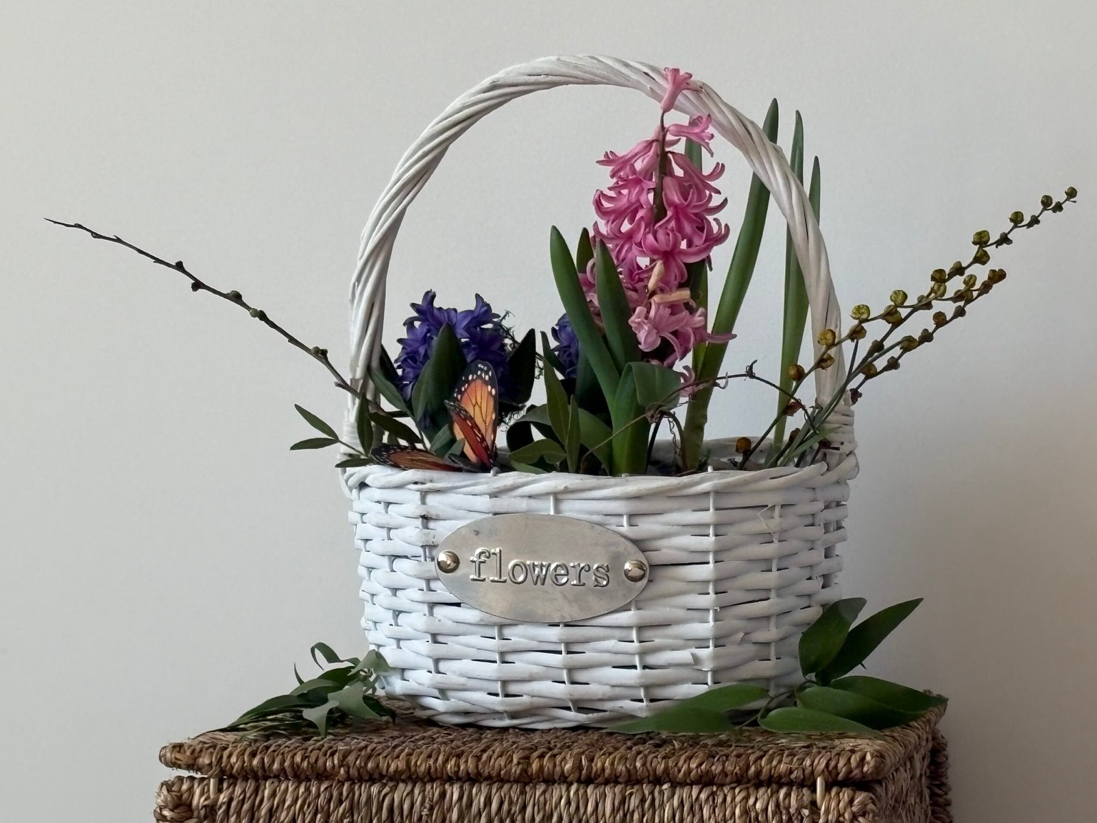 În acest coș elegant se întâlnesc zambile intens parfumate și narcise luminoase, crescute din bulbi îngrijiți cu răbdare în propria noastră sera. Fiecare floare este parte dintr-o mică poveste a primăverii – autentică, naturală și plină de prospețime.