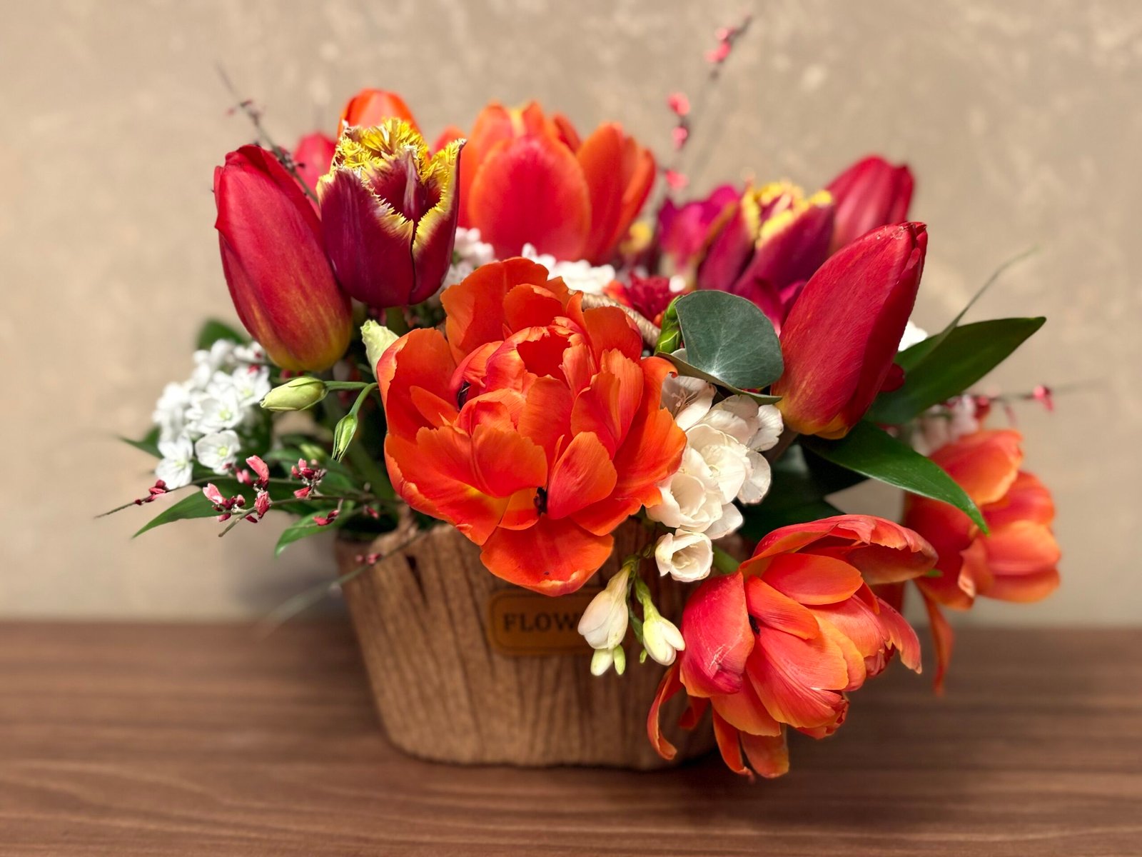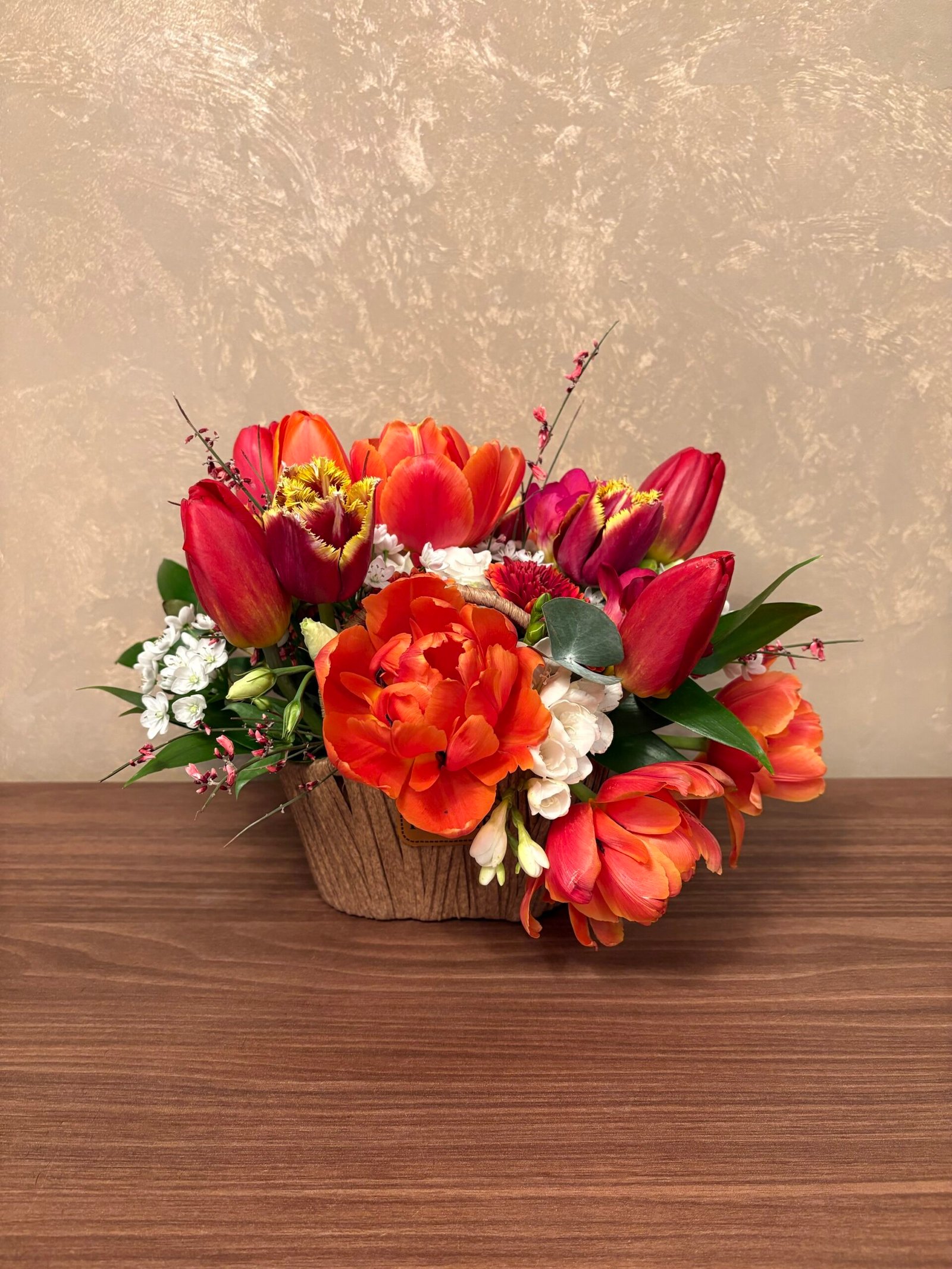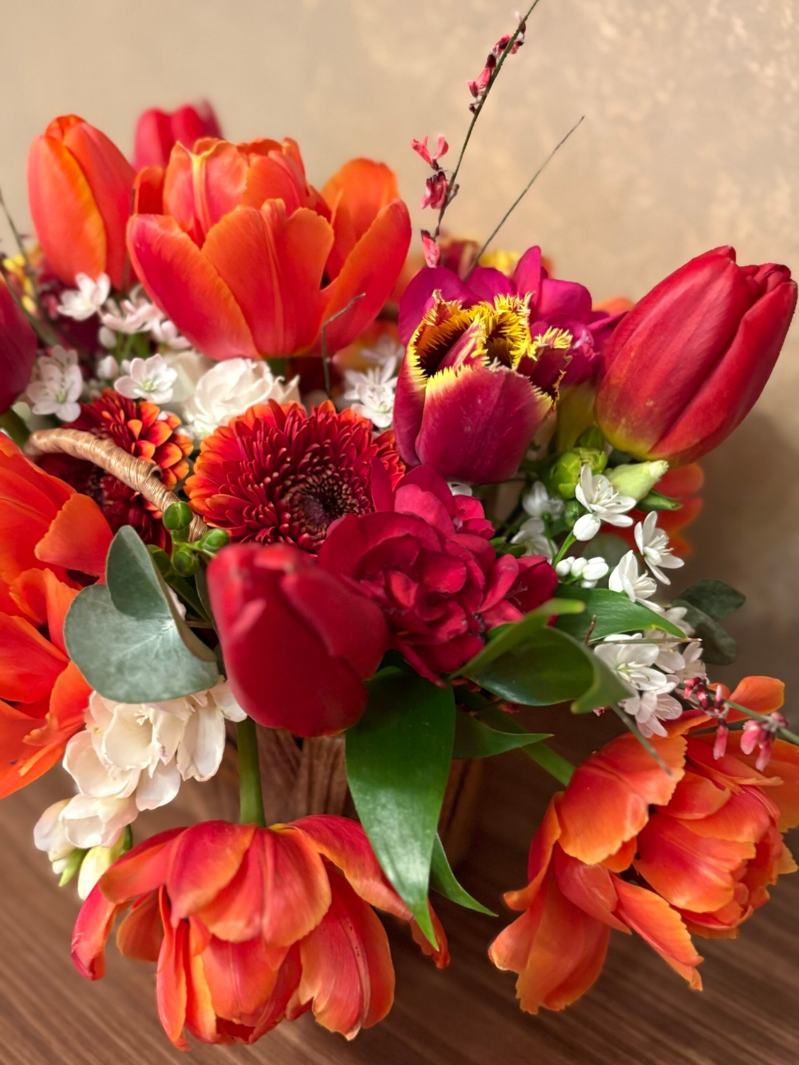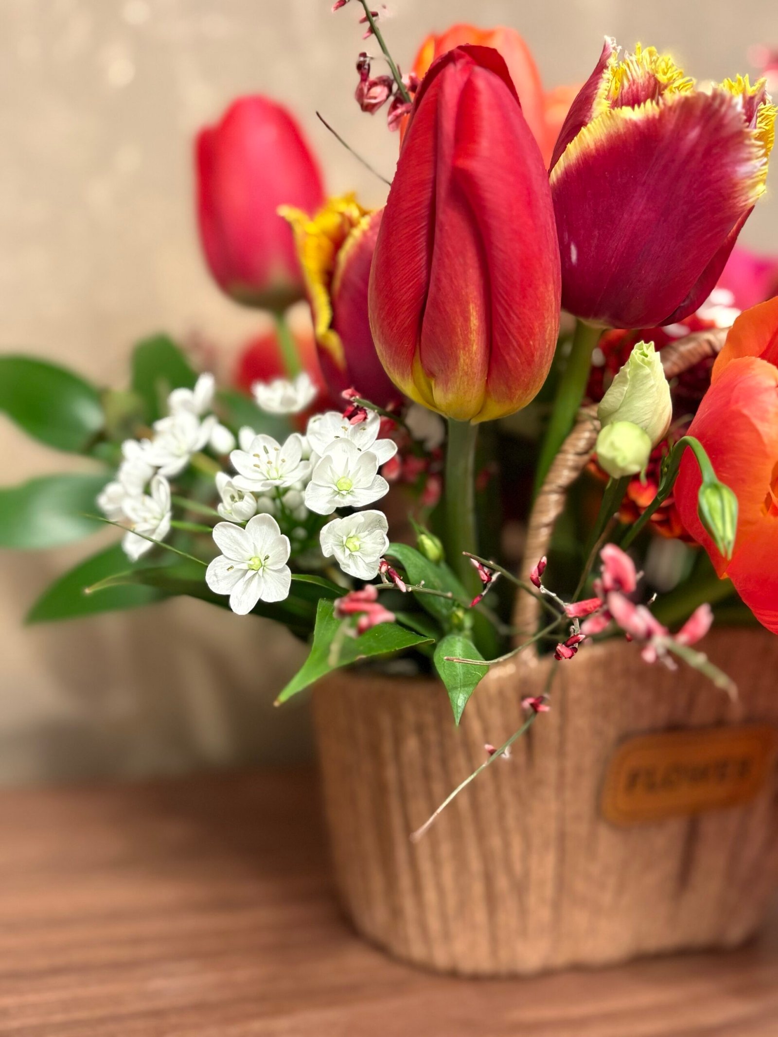 Un aranjament care aduce energia și căldura primăverii direct în suflet. „Poem cu lalele” îmbină armonios lalelele în nuanțe vibrante de roșu, corai și portocaliu, completate delicat de flori albe și accente naturale verzi, pentru un contrast rafinat și luminos.