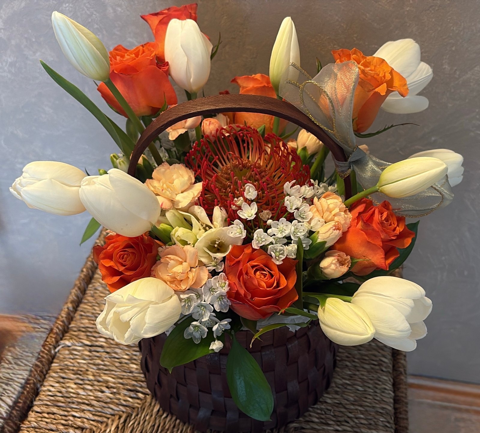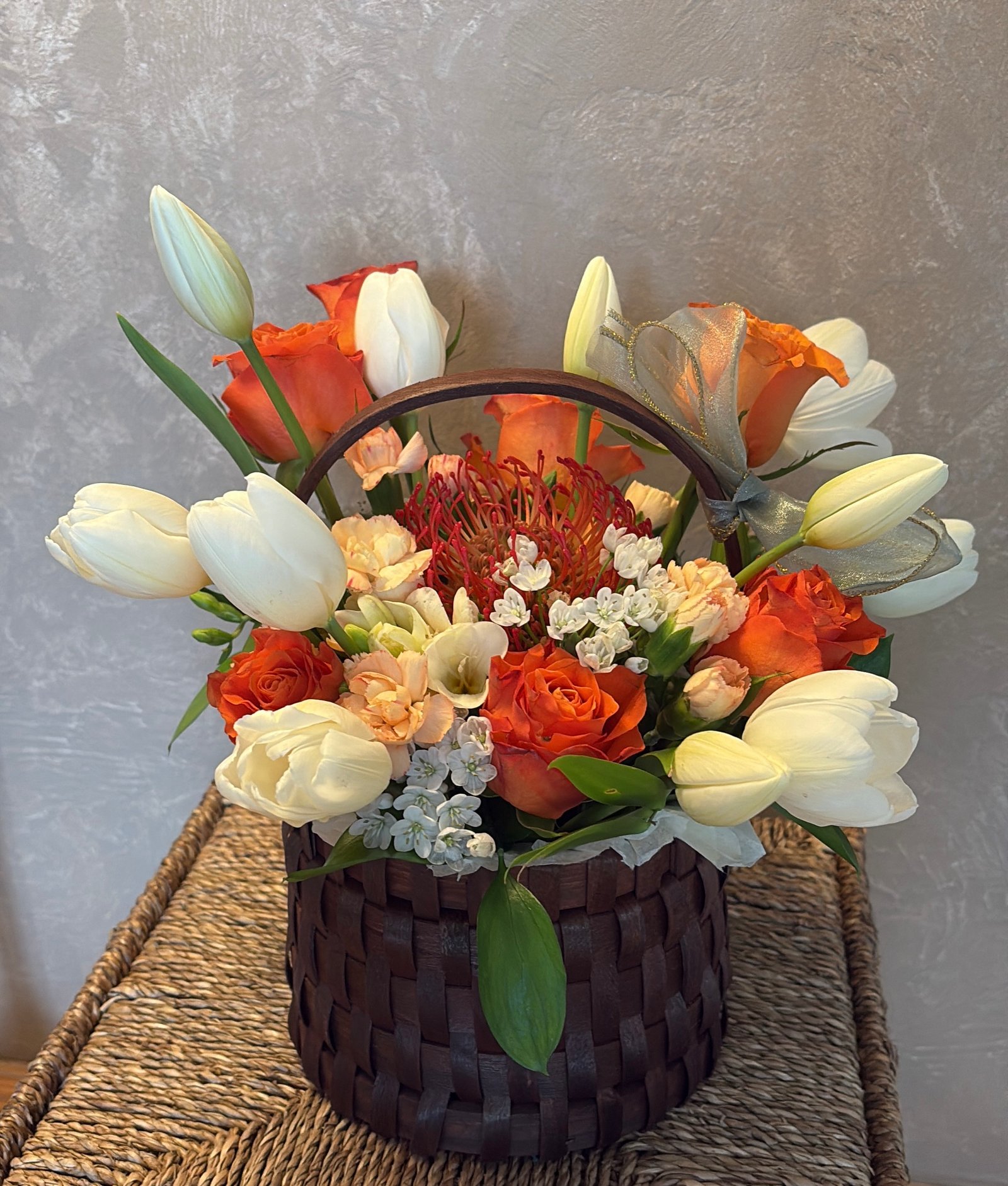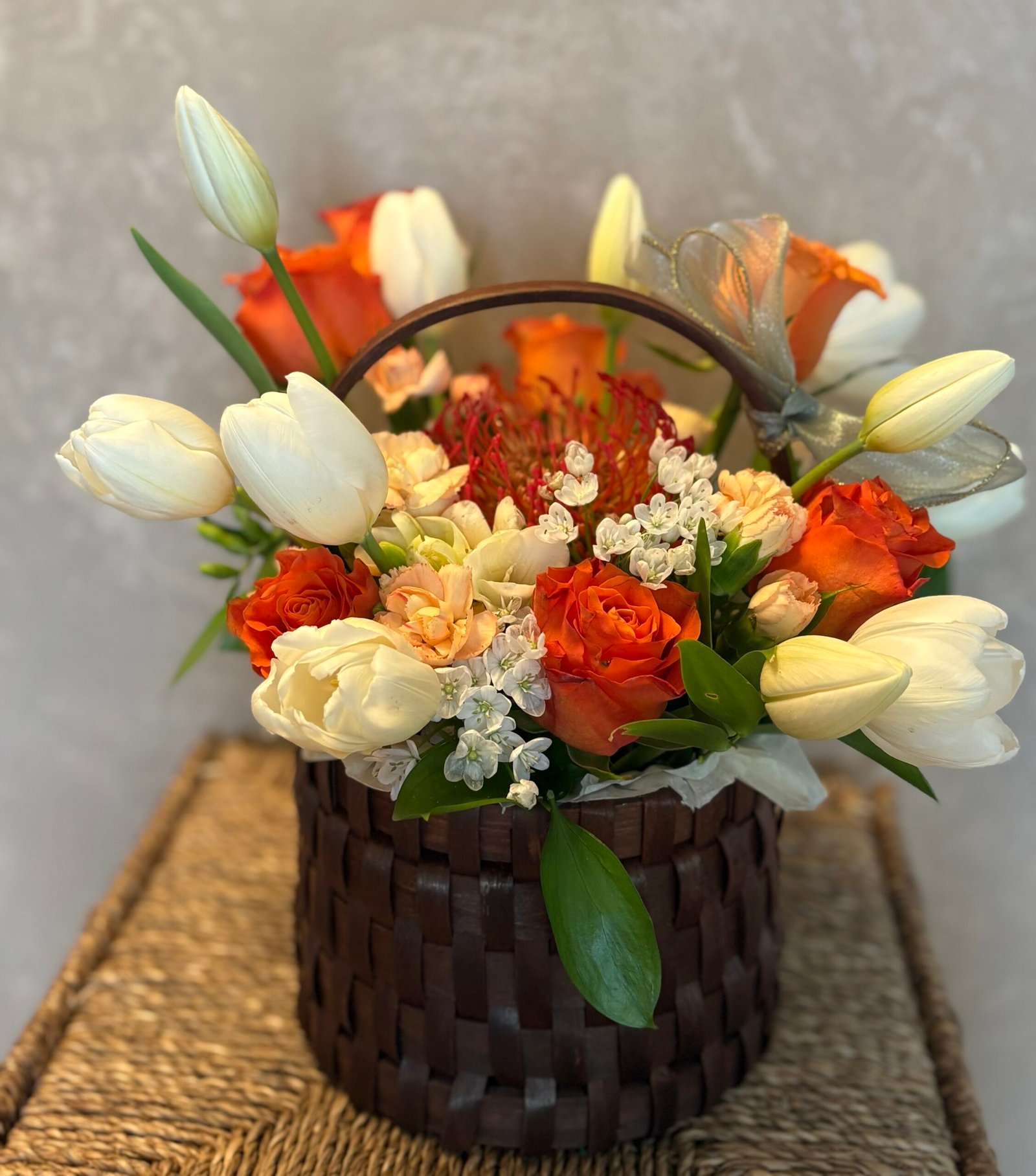În centrul compoziției, protea – spectaculoasă și expresivă – devine punctul de atracție, simbol al forței și al frumuseții neobișnuite. Florile sunt atent așezate într-un coș elegant, cu aer natural, completat discret de un detaliu decorativ fin, ce adaugă un plus de grație întregului ansamblu.