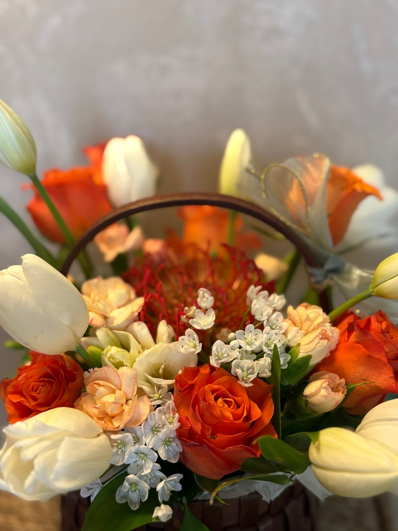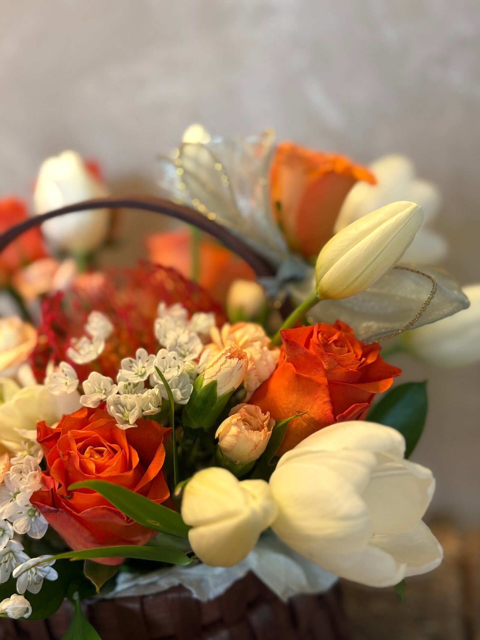 Un aranjament floral care aduce căldura unui răsărit blând direct în suflet. „Răsărit de Eleganță” îmbină armonios tonurile calde de portocaliu ale trandafirilor cu delicatețea lalelelor albe, creând un contrast rafinat și plin de lumină.