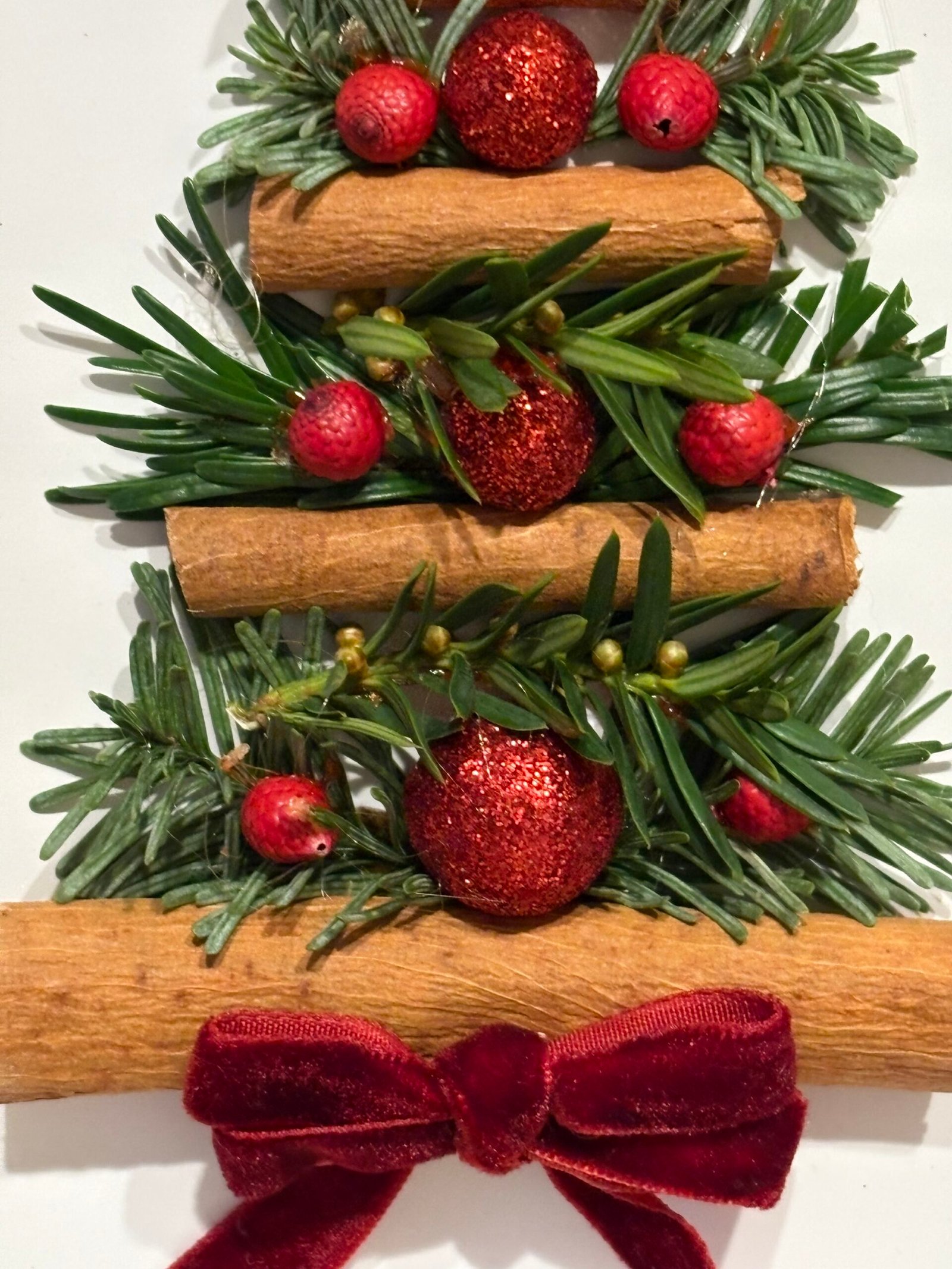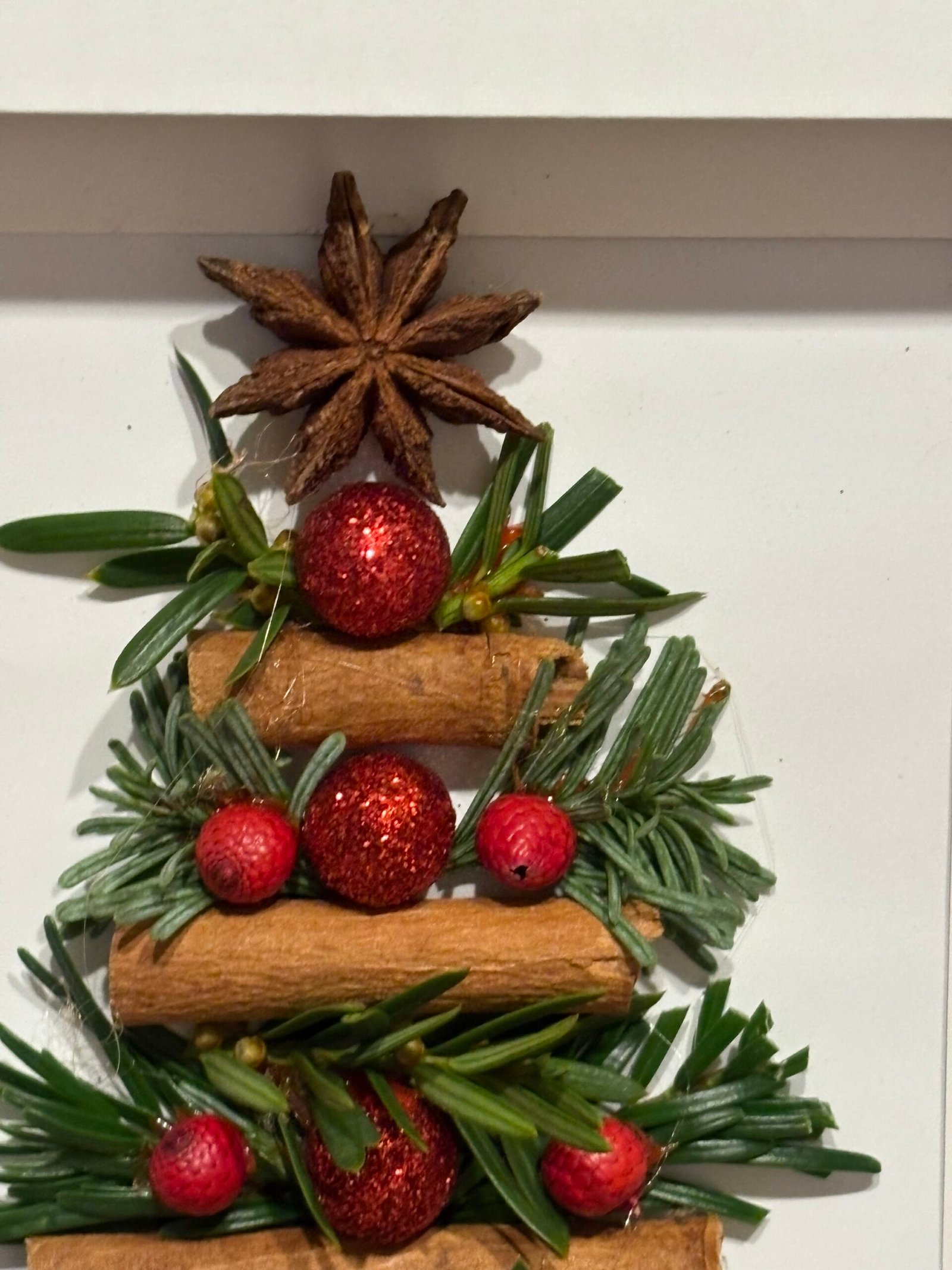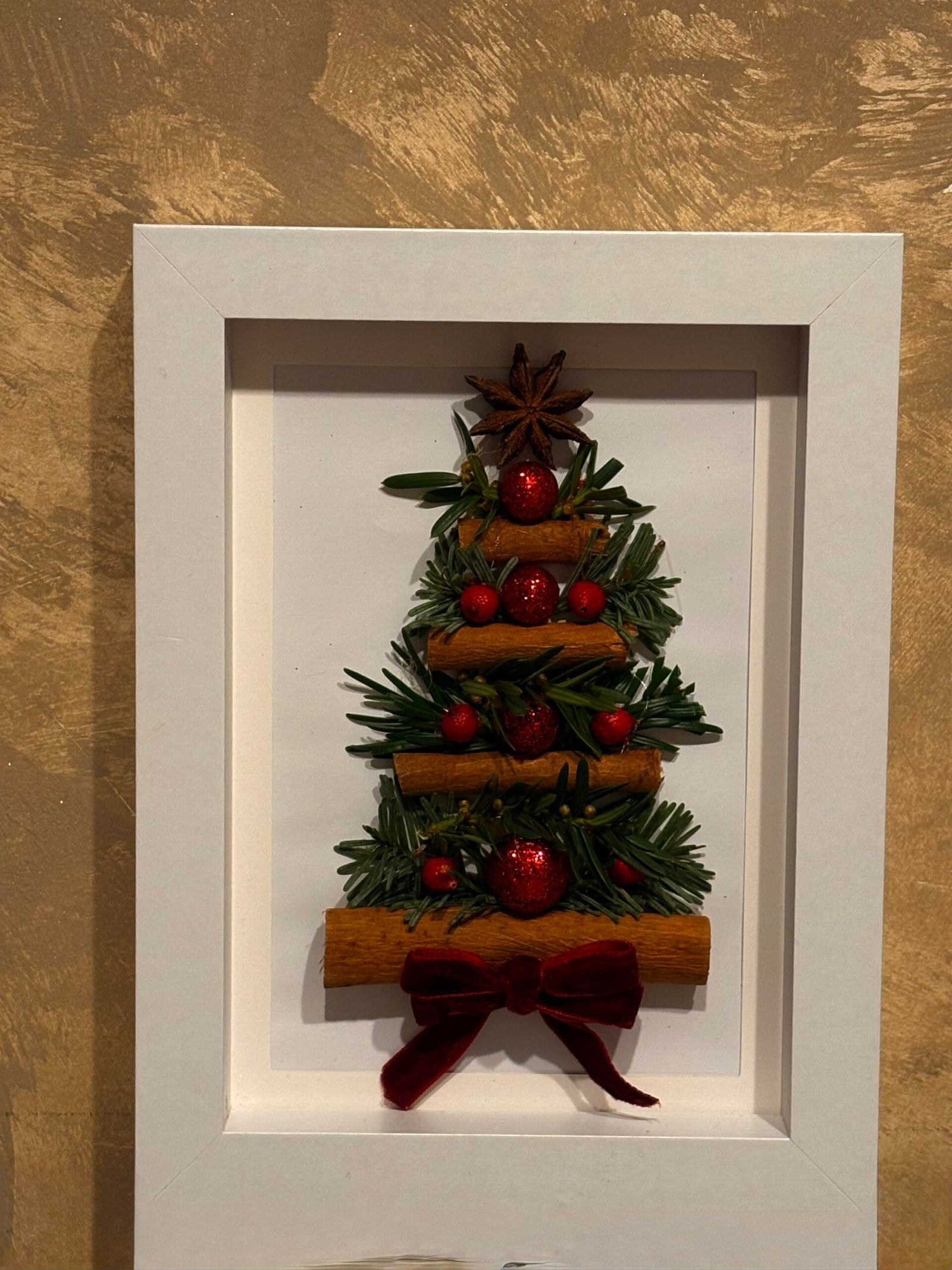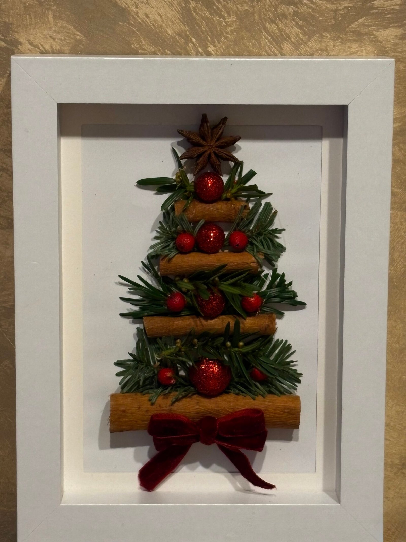 Un brad miniatural prinde viață într-o ramă albă ca prima zăpadă. Batoanele de scorțișoară devin trepte calde spre iarnă, ramurile de brad aduc prospețimea pădurii, iar bobițele roșii strălucesc ca niște mici comori ale bucuriei. În vârf, o stea de anason veghează discret, răspândind eleganță și un strop de magie.