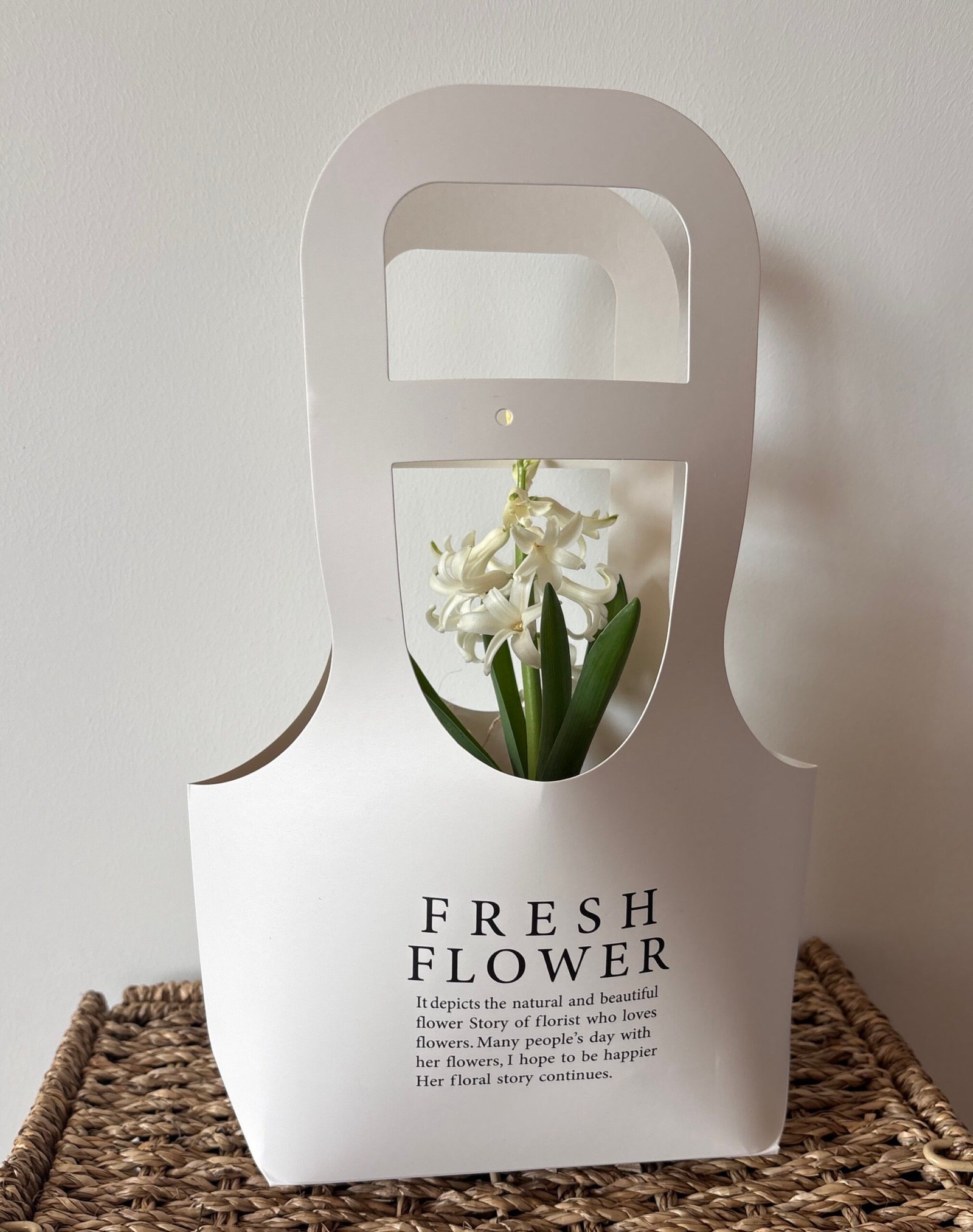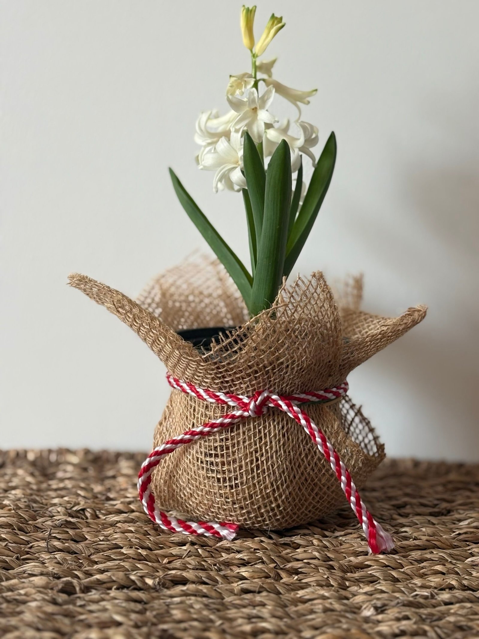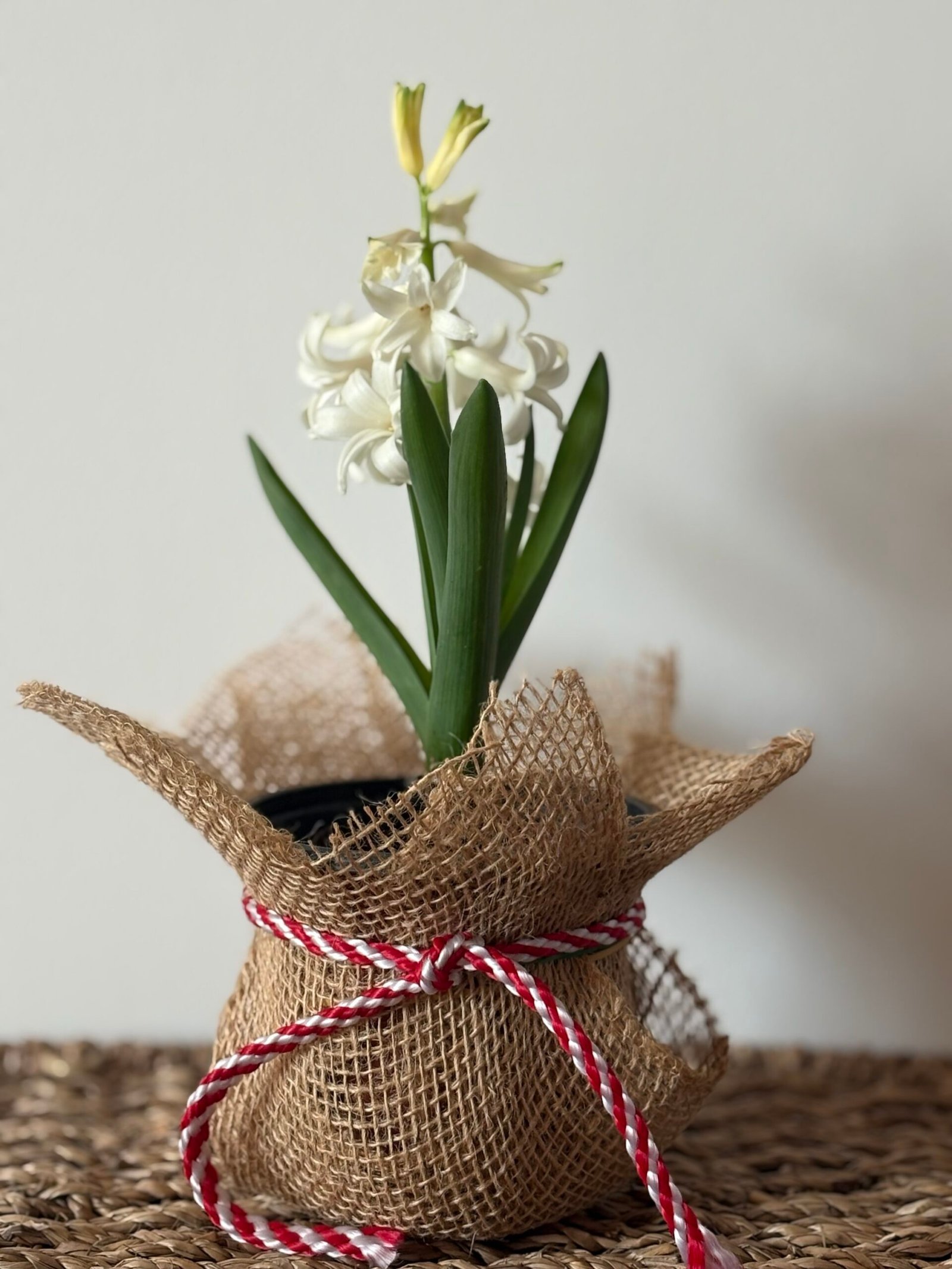 Zambila albă, elegantă și parfumată, este prezentată într-un ghiveci îmbrăcat în iută, legat cu șnur tradițional roșu-alb — un detaliu care face trimitere discretă la simbolul Mărțișorului.